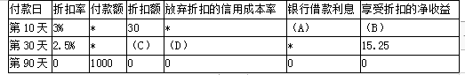 解析  (1)A=1000×(1-3%)×6%×80/360=12.93(万元)   B=30-12.93=17.07(万元)   C=1000×2.5%=25(万元)   D=2.5%/(1-2.5%)×360/(90-30)=15.38%   (2)应该选择在第10天付款,因为10天付款的净收益最大。