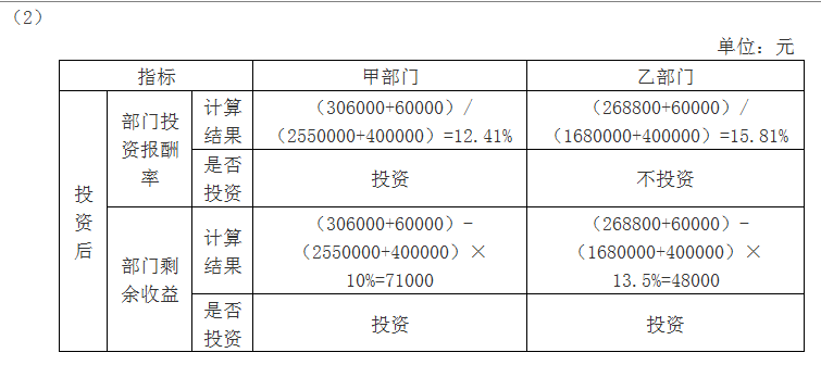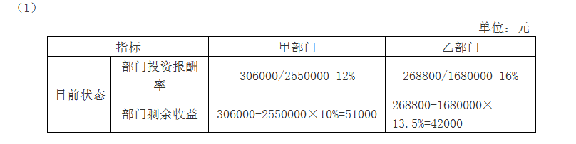 解析 (3)甲部门的经济增加值=229500-1473500×12.58%=44133.7(元) 乙部门的经济增加值=201600-1473500×10.44%=47766.6(元) 计算结果表明,虽然乙部门税后经营净利润不如甲部门高,但其经济增加值大。因此,从经济增加值的角度来看,乙部门的业绩更好。