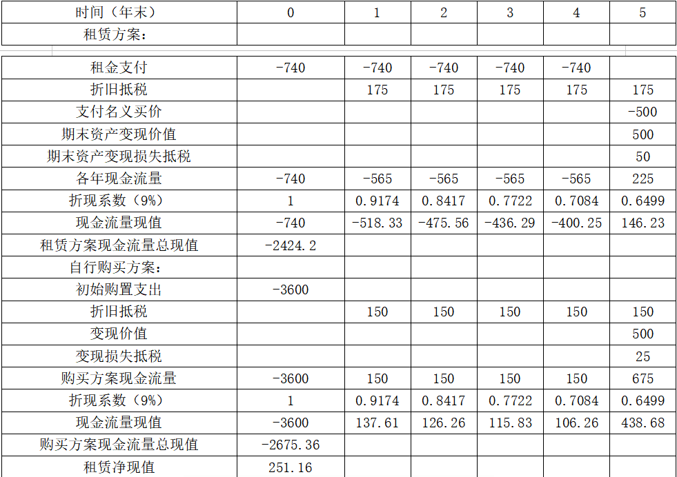 解析 租期/税法规定可使用年限=5/6=83.33%>规定的75%,属于融资租赁,租赁费不可以税前抵扣。 税后有担保的借款利率=12%×(1-25%)=9% 租赁方案:租赁资产的计税基础=500+740×5=4200(万元) 租赁资产折旧=4200/6=700(万元) 租赁资产折旧抵税=700×25%=175(万元) 第5年年末账面价值=4200-700×5=700(万元) 变现损失抵税=(700-500)×25%=50(万元) 购置方案:年折旧=3600/6=600(万元) 折旧抵税=600×25%=150(万元) 第5年年末账面价值=3600-600×5=600(万元) 变现损失抵税=(600-500)×25%=25(万元) 租赁净现值 单位:万元 因为租赁净现值大于0,所以应选择租赁方案。