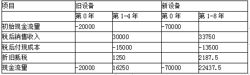 解析 (1)计算新旧设备现金流量 (2)计算新旧设备的净现值  使用旧设备净现值=16250×(P/A,10%,4)-20000=31512.5(元)   使用新设备净现值=22437.5×(P/A,10%,8)-70000   =49704.1(元)   资料再现:使用旧设备初始现金流量-20000元,年营业现金流量16250元,还可用4年;使用新设备初始现金流量-70000元,年营业现金流量22437.5元, 使用8年,项目资本成本10%   (3)采用共同年限法计算调整后的净现值   使用旧设备调整后的净现值(8年)   31512.5+31512.5×(P/F,10%,4)=53035.54(元)   使用新设备的净现值(8年)=49704.1(元)   使用旧设备的调整后净现值大于使用新设备的净现值,所以应该继续使用旧设备。   (4)计算使用新旧设备的等额年金   使用旧设备的等额年金   =31512.5/(P/A,10%,4)=9941.17(元)   使用新设备的等额年金   =49704.1/(P/A,10%,8)=9316.78(元)   由于使用新旧设备的项目资本成本均是10%,无须计算永续净现值即可比较方案优劣。使用旧设备的等额年金高于使用新设备的等额年金,应该继续使用旧设备。