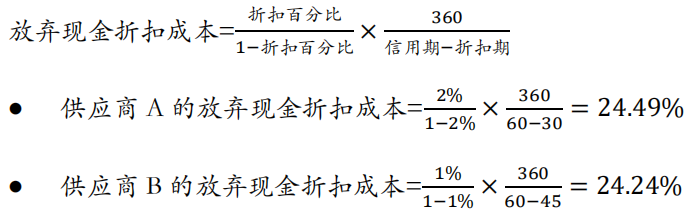 问题 甲公司计划采购一批100万元的货物,供应商A提出的信用条件2/、n/60,供应商B提出的信用条件是1/、n/60,同期的银行短期借款年利率为12%,通过衡量放弃折扣成本的大小(按单利计算),应当选择( )。