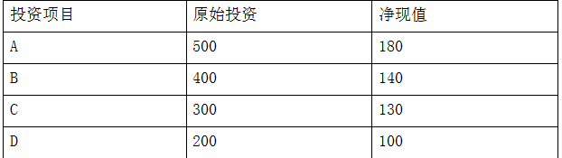 问题 甲公司可以投资的资本总量为1000万元,目前有A、B、C、D四个投资项目可供选择,其中A与D是互斥项目,有关资料如下(金额单位:万元): 则最优的投资组合是( )。