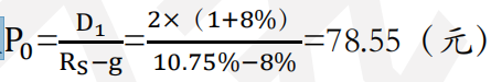 解析 资本成本往往结合债券与股票的价值评估出题,其中股权资本成本的计算在客观题中最常考资本资产定价模型和债券收益率风险调整模型,股票价值评估则最常考固定股利增长模型,本题将两者进行了结合。 ?甲公司股权资本成本=9%×(1-25%)+4%=10.75%