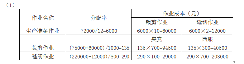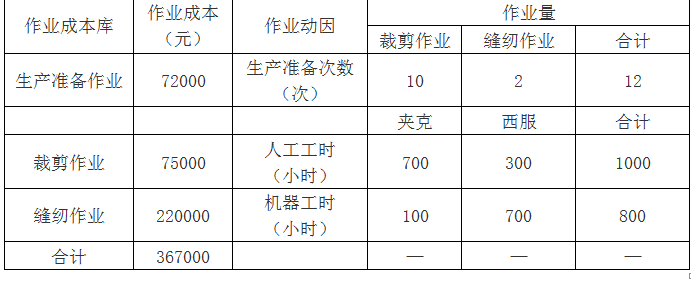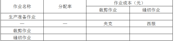 问题 甲公司是一家服装生产企业,按订单组织生产,2020年9月接受订单加工200件夹克和100件西服。西服和夹克均需先后经过裁剪和缝纫两道作业工序方可完成。原材料均在开工时一次性投入。2020年9月生产成本相关资料如下: (1)本月生产量。(单位:件) 公司财务部门和生产技术部门对生产过程进行了分析,识别出三项作业,分别是生产准备作业、裁剪作业和缝纫作业。生产准备作业负责对裁剪作业、缝纫作业进行生产准备,作业动因是生产准备次数;裁剪作业的作业动因是裁剪人工工时;缝纫作业的作业动因是缝纫机器工时。直接人工成本不再单列成本项目,被归入相应作业库。 (2)月末在产品。 夹克在产品100件,全部处于裁剪制造阶段,尚未进入缝纫加工阶段,平均完成裁剪作业的50%;西服在产品50件,裁剪作业全部完成,缝纫加工作业平均完成40%。 (3)本月直接材料费用。 夹克领用X材料的成本为10000元、西服领用Y材料的成本为30000元;共同耗用Z材料3000尺,单价5元/尺,本月西服、夹克的Z材料单耗相同,按产品产量进行分配。 (4)本月制造费用。 要求: (1)编制作业成本分配表(结果填入下方表格中,不用列出计算过程)。 (2)编制产品成本计算单(结果填入下方表格中,不用列出计算过程)。