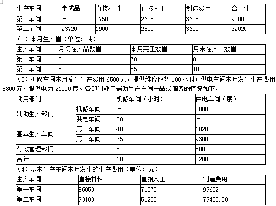 解析 (1)辅助生产费用分配表(交互分配法) (2)第一车间半成品成本计算单   2014年8月  单位:元 半成品发出单价=(46440+259000)÷(13+70)=3680(元/吨)   本月半成品费用=3680×71=261280(元)