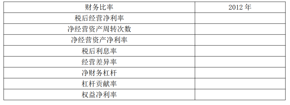 问题 甲公司是一家机械加工企业,采用管理用财务报表分析体系进行权益净利率的行业平均水平差异分析。该公司2012年主要的管理用财务报表数据如下: 单位:万元 要求: (1)基于甲公司管理用财务报表有关数据,计算下表列出的财务比率(结果填入下方表格中,不用列出计算过程)。 (2)计算甲公司权益净利率与行业平均权益净利率的差异,并使用因素分析法,按照净经营资产净利率、税后利息率和净财务杠杆的顺序,对该差异进行定量分析。
