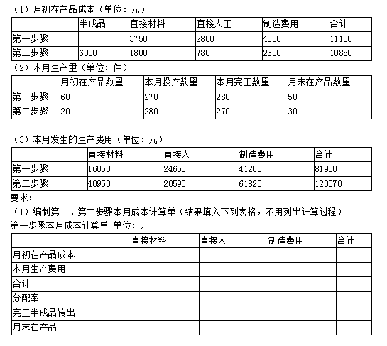 问题 甲公司是一家机械制造企业,只生产销售一种产品。生产过程分为两个步骤,第一步骤产出的半成品直接转入第二步骤继续加工,每件半成品加工成一件产成品。产品成本计算采用逐步综合结转分步法,月末完工产品和在产品之间采用约当产量法分配生产成本。 第一步骤耗用的原材料在生产开工时一次投入,其他成本费用陆续发生;第二步骤除耗用第一步骤半成品外,还需要追加其他材料,追加材料及其他成本费用陆续发生;第一步骤和第二步骤月末在产品完工程度均为本步骤的50%。 (1)月初在产品成本(单位:元)
