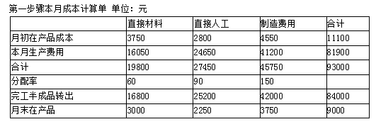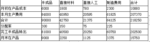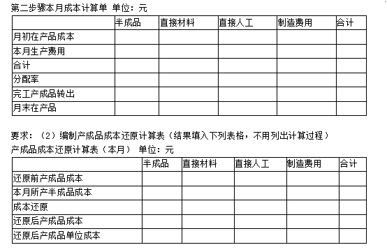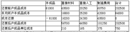 解析 填表说明:   直接材料分配的约当产量=280+50=330(件)   直接材料分配率=19800÷330=60(元/件)   完工半成品转出直接材料=280×60=16800(元)   直接人工分配的约当产量=280+50×0.5=305(件)   直接人工分配率=27450÷305=90(元/件)   完工半成品转出直接人工=280×90=25200(元)   制造费用分配的约当产量=280+50×0.5=305(件)   制造费用分配率=45750÷305=150(元/件)   完工半成品转出制造费用=280×150=42000(元)   第二步骤本月成本计算单 单位:元 填表说明:   半成品分配的约当产量=270+30=300(件)   半成品分配率=90000÷300=300(元/件)   完工产成品转出半成品=270×300=81000(元)   直接材料分配的约当产量=270+30×0.5=285(件)   直接材料分配率=42750÷285=150(元/件)   完工产成品转出直接材料=270×150=40500(元)   直接人工分配的约当产量=270+30×0.5=285(件)   直接人工分配率=21375÷285=75(元/件)   完工产成品转出直接人工=270×75=20250(元)   (2)产成品成本还原计算表(本月) 单位:元 备注:还原前产成品成本,即第二步骤完工产成品的转出数;本月所产半成品成本是第一步骤完工转出数;还原分配率为81000/84000