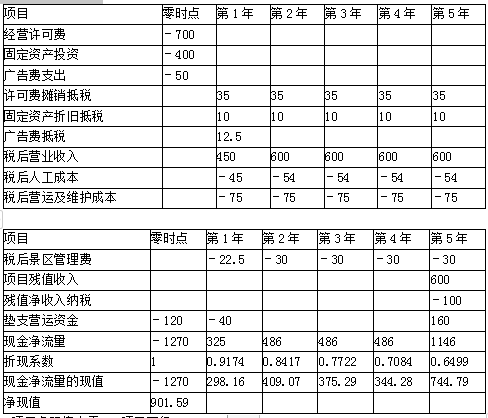 解析 (1)无风险利率为5年后到期的政府债券的到期收益率,即4.3%。   公司信用风险补偿率=[(6.5%-3.4%)+(7.6%-3.6%)+(8.3%-4.3%)]÷3=3.7%   税前债务资本成本=4.3%+3.7%=8%   股权资本成本=8%×(1-25%)+5%=11%   加权平均资本成本   =8%×(1-25%)×(2/5)+11%×(3/5)=9%   (2)单位:万元 W项目净现值大于0,项目可行。   (3)游客人次下降10%时项目净现值变化=120×10%+40×10%×(P/F,9%,1)-[600×10%×(1-5%)×(1-25%)]×(P/F,9%,1)-[800×10%×(1-5%)×(1-25%)]×(P/A,9%,4)×(P/F,9%,1)-160×10%×(P/F,9%,5)=-203.36(万元)   净现值对游客人次的敏感系数   =(-203.36/901.59)/(-10%)=2.26