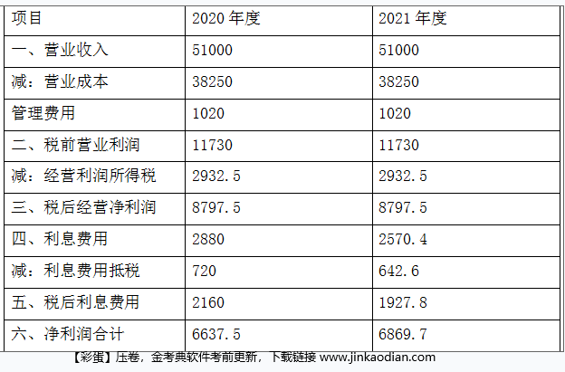 解析 (1)2020年末、2021年末的预计资产负债表 单位:万元 (2分) 2020年度、2021年度的预计利润表 单位:万元 (2)2020年的实体现金流量=税后经营净利润-净经营资产增加=8797.5-(45900-45000)=7897.5(万元)(1分) 2021年的实体现金流量=税后经营净利润-净经营资产增加=8797.5-(45900-45900)=8797.5(万元)(1分) (3)实体价值=7897.5×(P/F,10%,1)+8797.5/(10%-2%)×(P/F,10%,1)=107152.21(万元)(1分) 或者:实体价值=7897.5×(P/F,10%,1)+8797.5×(P/F,10%,2)+8797.5×(1+2%)/(10%-2%)×(P/F,10%,2)=107152.21(万元) 这两种计算实体价值的方法后续期价值的计算不同,但最终的结果是一样的。 8797.5×(P/F,10%,2)+8797.5×(1+2%)/(10%-2%)×(P/F,10%,2) =8797.5/(10%-2%)×(P/F,10%,2)×[(10%-2%)+(1+2%)] =8797.5/(10%-2%)×(P/F,10%,2)×(1+10%) =8797.5/(10%-2%)×(P/F,10%,1) 股权价值=107152.21-36000=71152.21(万元) 每股价值=71152.21/8000=8.89(元) 目前市价每股10元,高于每股价值,所以,甲公司的股价被市场高估。(1分)