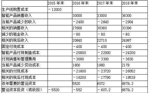 问题 甲公司是一家移动通讯产品制造公司,主营业务是移动通讯产品的生产和销售,为了扩大市场份额,准备投产智能型手机产品(简:智能产品)。目前相关技术研发已经完成,正在进行该项目的可行性研究。资料如下: 如果可行,该项目拟在2016年初投产,预计该智能产品3年后(即2018年末)停产,即项目预期持续3年。智能产品单位售价3000元,2016年销售10万部,销量以后每年按10%增长,单位变动制造成本为2000元,每年付现固定制造费用400万元,每年付现销售和管理费用与销售收入的比例为10%。 为生产该智能产品,需添置一条生产线,预计购置成本12000万元。生产线可在2015年末前安装完毕。按税法规定,该生产线折旧年限4年,预计净残值率为5%,采用直线法计提折旧,预计2018年末该生产线变现价值为2400万元。 公司现有一闲置厂房对外出租,每年年末收取租金80万元,该厂房可用于生产该智能产品,因生产线安装期较短,安装期间租金不受影响。由于智能产品对当前产品的替代效应,当前产品2016年销量下降1.5万部,下降的销量以后按每年10%增长, 2018年智能产品停产,替代效应消失,2019年当前产品销量恢复至智能产品投产前水平。当前产品的单位售价1600元,单位变动成本为1200元。 营运资本为销售收入的20%,智能产品项目垫支的营运资本在各年年初投入,在项目结束时全部收回,减少的当前产品的垫支的营运资本在各年年初收回,智能产品项目结束时重新投入。 项目加权平均资本成本为9%,公司适用的所得税税率为25%,假设该项目的初始现金流量发生在2015年年末,营业现金流量均发生在以后各年末。 要求:(1)计算项目的初始现金流量(2015年末增量现金净流量)、2016-2018年的增量现金净流量及项目的净现值、折现回收期和现值指数,并判断项目可行性。 要求:(2)为分析未来不确定性对该项目净现值的影响,应用最大最小法计算单位变动制造成本的最大值,应用敏感程度法计算单位变动制造成本上升5%时,净现值对单位变动制造成本的敏感系数。