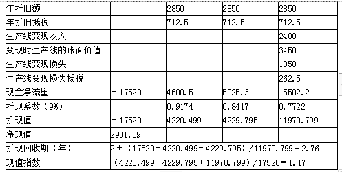 解析 由于项目的净现值大于0,所以该项目具有可行性。   (2)假设单位变动制造成本的最大值为W元,则:智能产品税后付现制造成本各年依次为10W×(1-25%)=7.5W(万元)、7.5W×1.1=8.25W(万元)、8.25 W×1.1=9.075W(万元),2016年~2018年各年的现金净流量(万元)分别为:   2016年现金净流量   =4600.5+20000×(1-25%)-7.5W=19600.5-7.5W   2017年现金净流量   =5025.3+22000×(1-25%)-8.25W=21525.3-8.25W   2018年现金净流量   =15502.2+24200×(1-25%)-9.075W=33652.2-9.075W   净现值   =(19600.5-7.5W)×0.9174+(21525.3-8.25W)×0.8417+(33652.2-9.075W)×0.7722-17520   =19600.5×0.9174-7.5W×0.9174+21525.3×0.8417-8.25W×0.8417+33652.2×0.7722-9.075W×0.7722-17520   =17981.499-6.8805W+18117.845-6.944W+25986.229-7.0077W-17520   =44565.573-20.8322W   根据净现值=0可知:   44565.573-20.8322W=0,即W=2139.26(元)   单位变动制造成本上升5%时,净现值减少额=20000×5%×(1-25%)×0.9174+22000×5%×(1-25%)×0.8417+24200×5%×(1-25%)×0.7722=750×0.9174+825×0.8417+907.5×0.7722=2083.224(万元),   净现值增长率=-2083.224/2901.09=-71.81%,所以,净现值对单位变动制造成本的敏感系数=-71.81%/5%=-14.36。