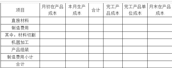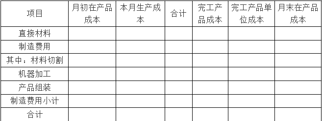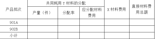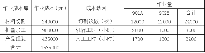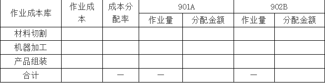 问题 甲公司是一家制造企业,生产A、B两种产品,按照客户订单分批组织生产,采用分批法核算产品成本。由于产品生产工艺稳定,机械化程度较高,制造费用在总成本中比重较大,公司采用作业成本法按实际分配率分配制造费用。公司设有三个作业成本库:材料切割作业库,以切割次数作为成本动因;机器加工作业库,以机器工时作为成本动因;产品组装作业库,以人工工时作为成本动因。 2018年9月,公司将客户本月订购A产品的18个订单合并成901A批,合计生产2000件产品;本月订购B产品的6个订单合并成902B批,合计生产8000件产品。A、B产品各自领用X材料,共同耗用Y材料。X、Y材料在各批次开工时一次领用,依次经材料切割、机器加工、产品组装三个作业完成生产。其中,材料切割在各批次开工时一次完成,机器加工和产品组装随完工进度陆续均匀发生。 9月末,901A批产品全部完工;902B批产品有4000件完工。4000件尚未完工。902B未完工产品机器加工完工进度50%,产品组装尚未开始。902B生产成本采用约当产量法(假设在产品存货发出采用加权平均法)在完工产品和月末在产品之间进行分配。 其他相关成本资料如下: (1)本月直接材料费用。 901A、902B分别领用X材料的成本为160000元、100000元;共同耗用Y材料20000千克,单价5元/千克,本月901A、902B的Y材料单耗相同,按产品产量进行分配。 (2)本月制造费用。 要求: (1)编制直接材料费用分配表、作业成本分配表(结果填入下方表格中,不用列出计算过程)。 直接材料费用分配表 单位:元 ? 作业成本分配表 单位:元 (2)编制901A、902B的产品成本计算单(结果填入下方表格中,不用列出计算过程)。 产品成本计算单 ? 产品批次:901A                           单位:元 产品成本计算单 ? 产品批次:902B                           单位:元