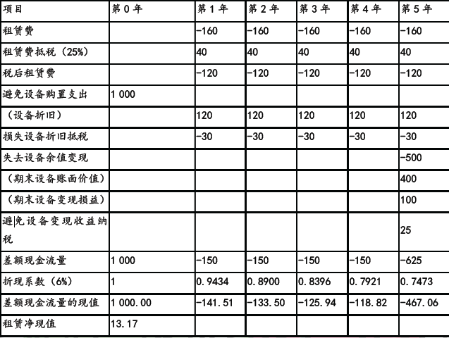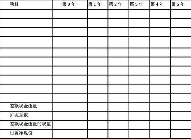 问题 甲公司是一家制造企业,为扩大产能决定添置一台设备。公司正在研究通过自行购置还是租赁取得该设备,有关资料如下: (1)如果自行购置,设备购置成本为1 000 万元。根据税法规定,设备按直线法计提折旧,折旧年限为8 年,净残值为40 万元。该设备预计使用5 年,5 年后的变现价值预计为500 万元。 (2)如果租赁,乙公司可提供租赁服务,租赁期5 年,每年年末收取租金160 万元,设备的维护费用由甲公司自行承担,租赁期内不得撤租,租赁期届满时设备所有权不转让。根据税法规定,甲公司的租赁费可以税前扣除。乙公司因大批量购置该种设备可获得价格优惠,设备购置成本为960 万元。 (3)甲公司、乙公司的企业所得税税率均为25%;税前有担保的借款利率为8%。 要求: (1)利用差额分析法,计算租赁方案每年的差额现金流量及租赁净现值(计算过程及结果填入下方表格中),判断甲公司应选择购买方案还是租赁方案并说明原因。 (2)计算乙公司可以接受的最低租金。