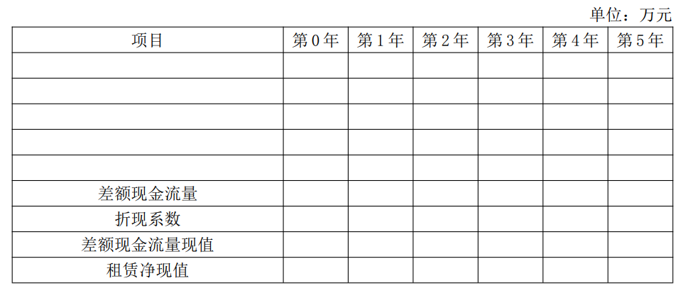 问题 甲公司是一家制造企业,为扩大产能决定添置一台设备。公司正在研究通过自行购置还是租赁取得设备。有关资料如下: (1)如果自行购置,设备购置成本为1000万元。根据税法规定,设备按直线法计提折旧,折旧年限为8年,净残值为40万元。该设备预计使用5年,5年后的变现价值预计为500万元。 (2)如果租赁,乙公司可以提供租赁服务,租赁期5年,每年年末收取租金160万元,设备的维护费用由甲公司自行承担,租赁期内不得撤租,租赁期届满时设备所有权不转让。根据税法规定,甲公司的租赁费可以税前扣除,乙公司因大批量购置该种设备可获得价格优惠,设备购置成本为960万元。 (3)甲公司、乙公司的企业所得税税率均为25%;税前有担保的借款利率为8%。 要求: (1)利用差额分析法,计算租赁方案每年的差额现金流量及租赁净现值(计算过程及结果填入下方表格中),判断甲公司应选择购买方案还是租赁方案并说明原因。 单位:万元 (2)计算乙公司可以接受的最低租金。