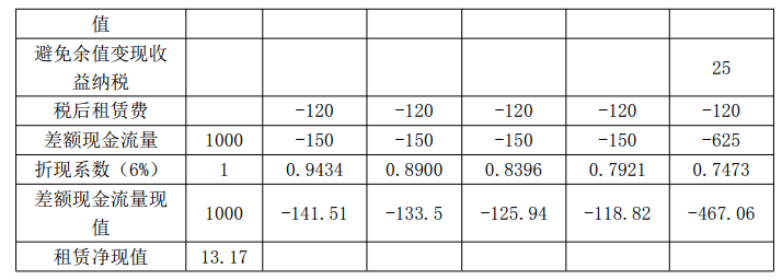 解析 由于租赁替代购买的净现值大于零,所以应选择租赁方案。 【解析】 自行购置年折旧额=(1000-40)/8=120(万元) 第5年末资产账面价值=1000-120×5=400(万元) 租赁替代购买损失设备折旧抵税=-120×25%=-30(万元) 租赁替代购买避免余值变现收益纳税=(500-400)×25%=25(万元) 税后租赁费=-160×(1-25%)=-120(万元) 折现率=8%×(1-25%)=6% 租赁替代购买的净现值=1000-150×(P/F,6%,1)-150×(P/F,6%,2)-150×(P/F,6%,3)-150×(P/F,6%,4)-625×(P/F,6%,5) =1000-150×0.9434-150×0.8900-150×0.8396-150×0.7921-625×0.7473=13.17(万元)。 (2)租赁设备年折旧额=(960-40)/8=115(万元) 期末租赁资产账面价值=960-115×5=385(万元) 设乙公司可以接受的最低租金为X,则有: NPV=-960+X×(1-25%)×(P/A,6%,5)+115×25%×(P/A,6%,5)+[500-(500-385)×25%] ×(P/F,6%,5),令NPV=0,则有:X×(1-25%)×(P/A,6%,5)+115×25%×(P/A,6%,5)+[500-(500-385)×25%]×(P/F,6%,5)=960,求得X=154.06(万元/年),即乙公司可以接受的最低租金为154.06万元。