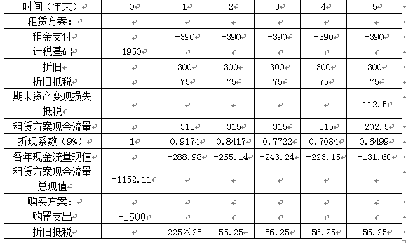 解析 (1)年折旧额=(1500-150)/6=225(万元) 第5年年末账面价值=1500-225×5=375(万元) 资产余值变现损失减税=(375-200)×25%=43.75(万元) 残值变现相关现金流量=200+43.75=243.75(万元) 营业现金流量=(800-300)×(1-25%)+225×25%=431.25(万元) 项目常规净现值=-1500-200+431.25×(P/A,15%,5)+(243.75+200)×(P/F,15%,5)=-1500-200+431.25×3.3522+(243.75+200)×0.4972=-33.73(万元) 因为净现值为负,所以企业自行购置设备进行投资是不可行的。 (2)该租赁不属于选择简化处理的短期租赁和低价值资产租赁,符合融资租赁的认定标准。 租赁资产的计税基础=390×5=1950(万元) 租赁资产的年折旧额=(1950-150)/6=300(万元) 每年折旧抵税=300×25%=75(万元) 税后有担保借款利率=12%×(1-25%)=9% 第5年年末账面价值=1950-300×5=450(万元) 残值变现抵税=450×25%=112.5(万元) 单位:万元 (3)项目的调整净现值=项目常规净现值+租赁净现值=-33.73-29.32=-63.05(万元),所以企业利用租赁扩充生产能力是不可行的。