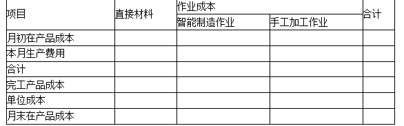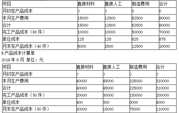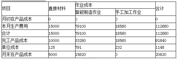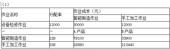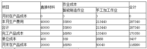 解析 计算说明:   智能制造作业的分配率=(53000+60000)/500=226(元/件),其中的60000是分配的设备检修作业成本。手工加工作业的分配率计算也是同样的思路。(220000+12000)/250=928(元/件)。   (2)A产品成本计算单   2019年9月 单位:元 计算说明:   由于直接材料在生产开始时一次投入,所以,A产品直接材料单位成本=15000/(80+40)=125(元/件);   由于A产品的月末在产品平均完成智能制造作业的50%,所以,A产品职能制造作业的单位成本=79100/(80+40×50%)=791(元/件);   由于A产品的月末在产品尚未进入手工加工阶段,所以,A产品的月末在产品不分配手工加工作业成本,即A产品手工加工作业成本单位成本=18560/80=232(元/件)。   B产品成本计算单   2019年9月     单位:元 计算说明:   由于直接材料在生产开始时一次投入,所以,B产品直接材料单位成本=40000/(50+50)=400(元/件);   由于B产品的月末在产品智能制造作业全部完成,因此,分配智能制造作业成本时,月末在产品的完工程度按照100%计算,即B产品智能制造作业单位成本=33900/(50+50×100%)=339(元/件);   由于B产品月末在产品手工加工作业平均完成60%,所以,分配手工加工作业成本时,单位成本=213440/(50+50×60%)=2668(元/件)。   (3)因为A产品单位成本1148元大于目前的单位售价1000元,所以A产品定价不合理。B产品单位成本3407元低于原来的单位售价3600元,所以B产品定价合理。