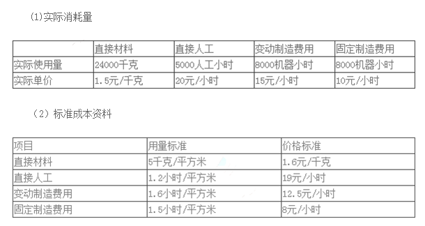 解析   (1)直接材料价格差异=24000X (1.5-1.6) = -2400 (元)   直接材料数量差异=(24000-5000X 5) X1.6= -1600 (元)   直接材料成本差异=-2400 -1600= -4000(元)   (2)直接人工的工资率差异=5000X (20-19)=5000 (元)   直接人工的人工效率差异=(5000-5000Xl.2) X19= -19000 (元)   直接人工成本差异=5000-19000= -14000 (元)   (3)变动制造费用的耗费差异=8000X (15-12.5) =20000 (元)   变动制造费用的效率差异=12. 5X (8000-5000X1.6) =0 (元)   变动制造费用的成本差异=20000(元)   (4)固定制造费用的耗费差异=8000X10-6000X1.5X8=8000(元)   固定制造费用的闲置能量差异=(6000×1.5-8000)×8=8000(元)   固定制造费用的效率差异=(8000-5000X1.5)X8=4000(元)   固定制造费用的成本差异=8000+8000+4000=20000(元)   (5)产品成本差异总额=-4000-14000+20000+20000=22000(元)   单位成本差异=22000/5000=4.4(元/平米)