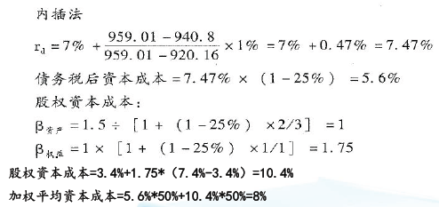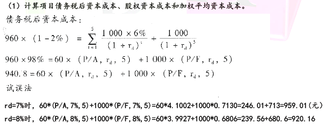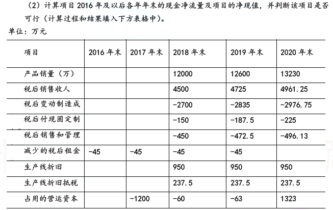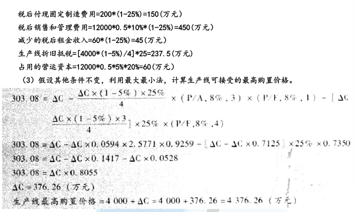 问题 甲公司是一家制造业上市公司, 主营业务是易拉罐的生产和销售。为进一步满足市场需求, 公司准备新增一条智能化易拉罐生产线。目前, 正在进行该项目的可行性研究。相关资料如下: ( 1)该项目如果可行,拟在20 1 6 年12 月31 日开始投资建设生产线,预计建设期1年,即项目将在20 1 7 年12 月31 日建设完成,20 1 8 年1 月1 日投产使用。该生产线预计购置成本4 00 0 万元, 项目预期持续3 年。按税法规定, 该生产线折旧年限4 年, 残值率5% , 按直线法计提折旧, 预计20 2 0 年12 月31 日项目结束时该生产线变现价值18 0 0 万元。 ( 2) 公司有一闲置厂房拟对外出租, 每年租金60 万元, 在出租年度的上年年末收取。该厂房可用于安装该生产线, 安装期间及投产后, 该厂房均无法对外出租。 ( 3) 该项目预计20 1 8 年生产并销售12 0 0 0 万罐, 产销量以后每年按5% 增长。预计易拉罐单位售价0. 5 元, 单位变动制造成本0. 3 元; 每年付现销售和管理费用占销售收人的10 % ;20 1 8 年、20 1 9 年、20 2 0 年每年固定付现成本分别为20 0 万元、25 0 万元、30 0万元。 ( 4) 该项目预计营运资本占销售收人的20 % 。垫支的营运资本在运营年度的上年年末投人, 在项目结束时全部收回。 ( 5)为筹集所需资金,该项目拟通过发行债券和留存收益进行筹资:发行期限5 年、面值10 0 0 元、票面利率6% 的债券,每年末付息一次,发行价格96 0 元,发行费用率为发行价格的2% ; 公司普通股(3 系数1. 5 , 无风险报酬率3. 4% , 市场组合必要报酬率7. 4% 。当前公司资本结构( 负债/权益) 为2/ 3 ; 目标资本结构( 负债/权益) 为1/ 1 。 ( 6) 公司所得税税率25 % 。 假设该项目的初始现金流量发生在20 1 6 年末, 营业现金流量均发生在投产后各年末。 要求: (1)计算项目债务税后资本成本、股权资本成本和加权等均资本成本。 (2)计算项目2016 年及以后各年年末的现金净流量及项目的净现值,并判断该项目是否可行(计算过程和结果填入下方表格中)。 单位:万元 ( 3) 假设其他条件不变, 利用最大最小法, 计算生产线可接受的最高购置价格。