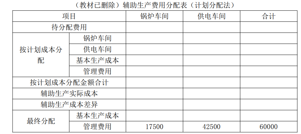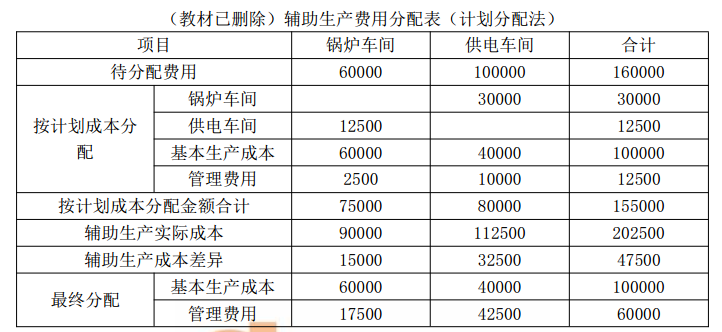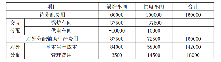 解析 ①直接分配法: 锅炉车间辅助生产费用对外分配率=60000/(15000-2500) =4.8(元/吨) 基本生产成本=12000×4.8=57600(元) 管理费用=500×4.8=2400(元) 供电车间辅助生产费用对外分配率=100000/(200000-75000) =0.8(元/度) 基本生产成本=100000×0.8=80000(元) 管理费用=25000×0.8=20000(元) ②交互分配法: 锅炉车间辅助生产费用交互分配率=60000/15000=4(元/吨) 供电车间辅助生产费用交互分配率=100000/200000=0.5(元/度) 锅炉车间辅助生产费用对外分配率=(60000-4×2500+0.5×75000) /(15000-2500) =7(元 /吨) 基本生产成本=12000×7=84000(元) 管理费用=500×7=3500(元) 供电车间辅助生产费用对外分配率=(100000+4×2500-0.5×75000)/(200000-75000)=0.58 (元/度) 基本生产成本=100000×0.58=58000(元) 管理费用=25000×0.58=14500(元)。 (2) ①采用直接分配法, 由于各辅助生产费用只是对外分配, 计算工作简便。 当辅助生产车间相互提供产品或劳务量差异较大时, 分配结果往往与实际不符。 因此, 这种分配方法只适宜在辅助生产内部相互提供产品或劳务不多、不进行费用的交互分配对辅助生产成本和产品制造成本影响不大的情况下采用。 ②采用交互分配法, 辅助生产内部相互提供产品或劳务全都进行了交互分配, 从而提高了分配结果的正确性。 但各辅助生产费用要计算两个单位成本(费用分配率), 进行两次分配,因而增加了计算工作量。 (教材已删除) ③采用计划分配法, 便于考核和分析各受益单位的成本, 便于分清各单位的经济责任, 但成本分配不够准确。 由于甲公司辅助生产车间内部相互提供产品或劳务较多、不进行费用的交互分配对辅助生产和产品制造成本影响较大, 不适合采用直接分配法分配辅助生产费用。 因此, 甲公司适合采用交互分配法对辅助生产费用进行分配。