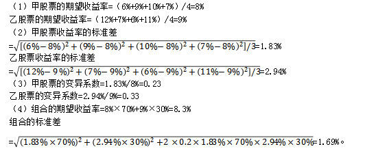 问题 假定甲、乙两只股票最近4年收益率的有关资料如下: 要求: (1)计算甲、乙两只股票的期望收益率; (2)计算甲、乙两只股票收益率的标准差; (3)计算甲、乙两只股票收益率的变异系数; (4)假设甲、乙两只股票收益率的相关系数为0.2,投资者将全部资金按照70%和30%的比例投资购买甲、乙股票构成投资组合,计算该组合的期望收益率和组合的标准差。