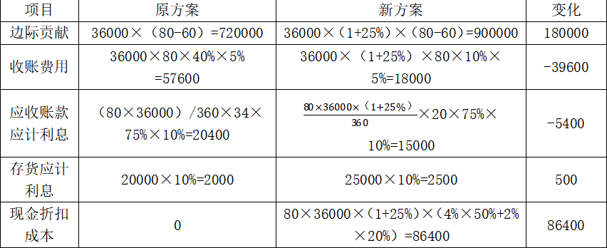 问题 科达公司只生产、销售一种产品,该产品的单价为80元,变动成本率为75%。公司目前采用30天按发票金额付款的信用政策,60%的顾客(按销售量计算,下同)能在信用期内付款,另外40%的顾客平均在信用期满后10天付款,逾期应收账款的收回需要支出占逾期账款5%的收账费用。公司每年的销售量为36000件,年平均存货周转次数为144次(按销售收入计算)。为扩大销售量、缩短平均收现期,公司拟推出“4/10,2/20,n/30”的现金折扣策略。采用该策略后,预计销售量会增加25%,50%的顾客会在第10天付款,20%的顾客会在第20天付款,20%的顾客会在第30天付款,另外10%的顾客平均在信用期满后20天付款,逾期应收账款的收回需要支出占逾期账款5%的收账费用。为了保证及时供货,其他条件不变。假设等风险投资的最低报酬率为10%,一年按360天计算。 要求: (1)计算改变信用政策后的边际贡献、收账费用、应收账款应计利息、存货应计利息、现金折扣成本的变化额。 (2)计算改变信用政策增加的净损益,并回答科达公司是否应推出该现金折扣策略。
