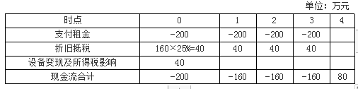 解析 购买方案: 每年折旧额=800×(1-0%)/5=160(万元) 4时点:设备账面价值=800-160×4=160(万元),处置设备现金流入40万元,形成损失160-40=120(万元),可以抵税120×25%=30(万元)。 租赁方案的项目净现值=-200-160×(P/A,8%,3)+80×(P/F,8%,4)=-553.54(万元) 租赁净现值=租赁方案的项目净现值-购买方案的项目净现值=82.4(万元) 由于租赁净现值大于0,故应该选择租赁方案。