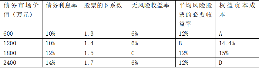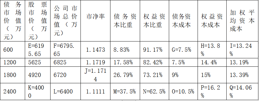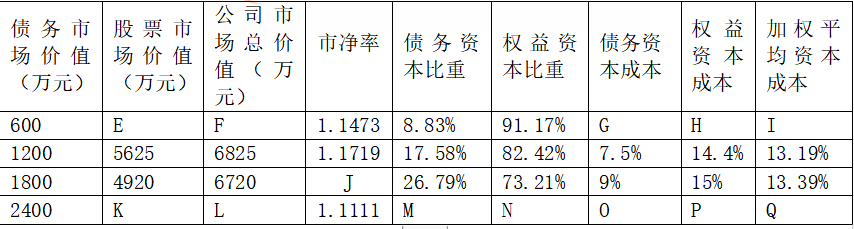 解析 (1)根据资本资产定价模型: A=6%+1.3×(12%-6%)=13.8% 14.4%=6%+1.4×(B-6%),计算得出B=12% 15%=C+1.5×(12%-C),计算得出C=6% D=6%+1.7×(12%-6%)=16.2% (2) E=净利润/权益资本成本=(1200-600×10%)×(1-25%)/13.8%=6195.65(万元) F=600+6195.65=6795.65(万元) G=10%×(1-25%)=7.5% H=A=13.8% I=7.5%×8.83%+13.8%×91.17%=13.24% J=4920/(6000-1800)=1.1714 K=(1200-2400×14%)×(1-25%)/16.2%=4000(万元) L=4000+2400=6400(万元) M=2400/6400=37.5% N=4000/6400=62.5% O=14%×(1-25%)=10.5% P=D=16.2% Q=10.5%×37.5%+16.2%×62.5%=14.06% (3)由于债务资本为1200万元时,企业价值最大,同时加权平均资本成本最低,所以债务资本为1200万元的资本结构最优。