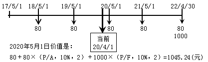 解析 1.  2020年4月1日价值是: 2.半年期折现率=(1+10.25%)^(1/2)-1=5%   2020年5月1日价值是:   40+40×(P/A,5%,4)+1000×(P/F,5%,4)=1004.54(万元)   2020年4月1日价值是: