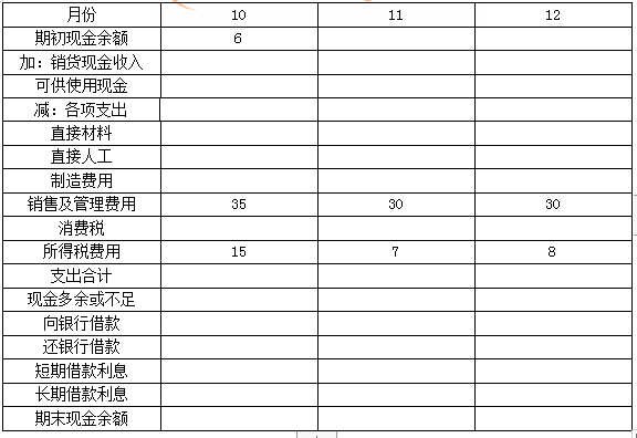 问题 某企业2020年有关预算资料如下: (1)预计该企业9~12月份的销售量如下: 单位:万件 每件产品销售单价为100元,每月销售收入中,当月收到现金40%,下月收到现金60%。假定该企业销售的产品在流通环节只需缴纳消费税,税率为10%,并于当月以现金缴纳。 (2)生产每件产品需要2千克A材料。公司的生产政策是每月的产成品存货数量等于下月销售量的20%,每月末的材料存量等于下月生产需要量的10%。年末存货预计为2500件,直接材料存量为2480千克。每千克材料5元,所购材料款于当月支付现金40%,下月支付现金60%。 (3)预计该企业10~12月份的制造费用分别为30万元、36万元、30万元;而直接人工为100人,每人每月工资为2000元。 (4)企业在9月末有长期借款100万元,年利息率为15%。 (5)预计该企业在现金不足时,向银行申请短期借款(5万元的整数倍);现金有多余时归还银行借款(5万元的整数倍)。借款在期初,还款在期末,借款年利率12%。 (6)预计该企业每月现金余额的最低要求是6万元,而年末最低可以为0;长期借款利息每季度末支付一次,短期借款利息还本时支付,其他资料见现金预算表。要求: (1)计算10~12月份销货现金收入; (2)计算10~12月各月采购直接材料支出; (3)根据以上资料,完成该企业10~12月份现金预算的编制工作。 现金预算表             单位:万元