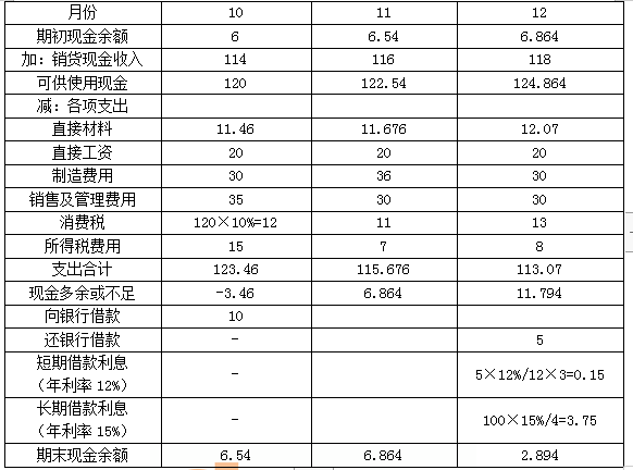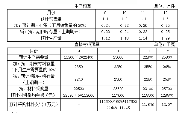 解析 (1)9月销售收入=1.1×100=110(万元) 10月销售收入=1.2×100=120(万元) 11月销售收入=1.1×100=110(万元) 12月销售收入=1.3×100=130(万元) 那么,10月销货现金收入=110×60%+120×40%=114(万元) 11月销货现金收入=120×60%+110×40%=116(万元) 12月销货现金收入=110×60%+130×40%=118(万元) (2) (3)现金预算表               单位:万元 注:直接人工为100人,每人每月工资为2000元,那么每月直接人工为100×0.2=20(万元)。