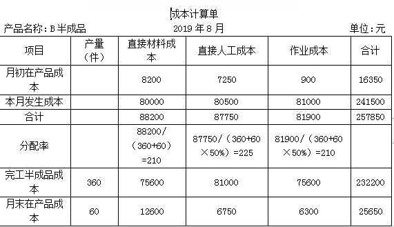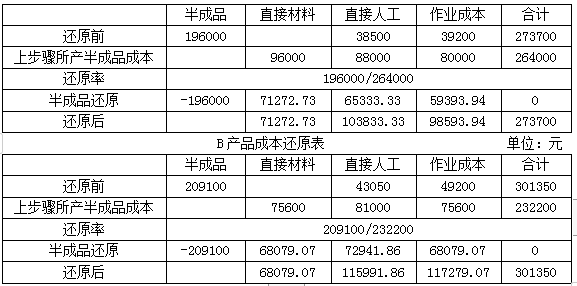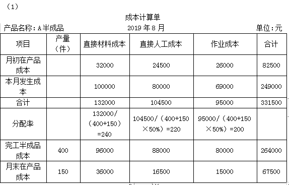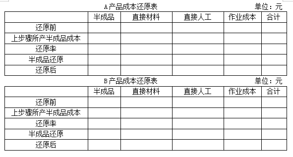 解析 (2) 成本计算单 产品名称:A产品        2019年8月              单位:元 成本计算单 产品名称:B产品         2019年8月             单位:元 (3) A产品成本还原表             单位:元