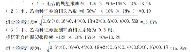 解析 ( 4 )以上计算结果表明,证券报酬率相关系数的大小对投资组合的期望报酬率没有影响,但对投资组合的标准差有影响,在其他条件不变的前提下,相关系数越大,投资组合的标准差越大,组合的风险也越大。