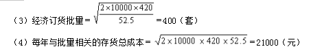 解析 (1)每次订货变动成本=订单处理成本+海关检查成本+订单抽检成本=(13400-10760)/22+280+8×2.5=420(元)   (2)单位变动储存成本=仓储成本+破损成本+利息及其他储存成本=4+28.5+20=52.5(元) 或者:每年与批量相关的存货总成本=400×52.5=21000(元)   (5)最佳订货次数=10000/400=25(次)   最佳订货周期=50×6/25=12(天)   (6)经济订货量占用资金=400/2×395=79000(元)