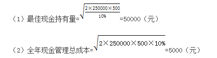 解析 全年现金交易成本=(250000/50000)×500=2500(元) 全年现金持有机会成本=(50000/2)×10%=2500(元) (3)全年有价证券交易次数=250000/50000=5(次) 有价证券交易间隔期=360/5=72(天)。