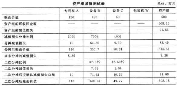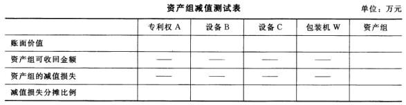问题 佳洁上市公司(以下简称“佳洁公司”)拥有一条由专利权A、设备B以及设备C组成的生产线,专门用于生产甲产品,该生产线至2009年12月31日已连续生产7年。另有一条由设备D、设备E和商誉(2008年吸收合并形成)组成的生产线专门用于生产乙产品。佳洁公司按照不同的生产线进行管理,产品甲存在活跃市场。生产线生产的甲产品,经包装机W进行外包装后对外出售。(1)甲产品生产线及包装机W的有关资料如下。①专利权A于2003年1月以400万元取得,专门用于生产甲产品。佳洁公司预计该专利权的使用年限为10年,采用直线法摊销,预计净残值为0。②专用设备B和C是为生产甲产品专门订制的,除生产甲产品外,无其他用途。这两项设备至2009年12月31日均已使用7年,预计使用年限均为10年,净残值均为0,均采用年限平均法计提折旧。设备B、C原价分别为1400万元、200万元。③包装机W系佳洁公司于2002年12月18日购入,原价180万元,用于对公司生产的部分产品(包括甲产品)进行外包装。该包装机由独立核算的包装车间使用。公司生产的产品进行包装时需按市场价格向包装车间内部结算包装费。除用于本公司产品的包装外,佳洁公司还用该机器承接其他企业产品包装,收取包装费。该机器的预计使用年限为10年,预计净残值为0,采用年限平均法计提折旧。(2)2009年,市场上出现了甲产品的替代产品,甲产品市价下跌,销量下降,出现减值迹象。2009年末,佳洁公司对与甲产品有关资产进行减值测试。①2009年12月31日,专利权A的公允价值为118万元,如将其处置,预计将发生相关费用8万元,无法独立确定其未来现金流量现值;设备B和设备C的公允价值减去处置费用后的净额以及预计未来现金流量的现值均无法确定;包装机W的公允价值为62万元,如处置预计将发生的费用为2万元,根据其预计提供包装服务的收费情况来计算,其未来现金流量现值为63万元。②佳洁公司管理层根据财务预算计算得到的甲产品生产线预计未来现金流量现值为508.15万元,无法合理预计甲产品生产线公允价值减去处置费用后的净额。(3)2009年,市场上出现了乙产品的替代产品,乙产品市价下跌,销量下降,出现减值迹象。2009年12月31日,佳洁公司对与乙产品有关资产进行减值测试。乙产品生产线的可收回金额为800万元。设备D、设备E和商誉的账面价值分别为600万元、400万元和200万元。两项设备的可收回金额均无法可靠取得。(4)其他有关资料:①佳洁公司与生产甲产品和乙产品相关的资产在2009年以前未发生减值。②佳洁公司不存在可分摊至产品甲和乙生产线的总部资产和商誉价值。③本题中有关事项均具有重要性。④本题中不考虑中期报告及所得税影响。 要求: (1)判断佳洁公司与生产甲产品相关的各项资产中,哪些资产构成资产组,并说明理由。 (2)计算包装机W在2009年12月31日的可收回金额。 (3)填列佳洁公司2009年12月31日与生产甲产品相关的资产组减值测试表,表中所列资产不属于资产组的,不予填列。 (4)计算佳洁公司2009年12月31日与生产乙产品相关的资产的减值金额。(5)编制佳洁公司2009年12月31日计提资产减值准备的会计分录(设备减值金额合并列示)。