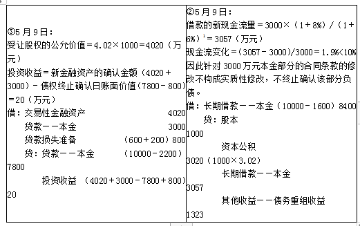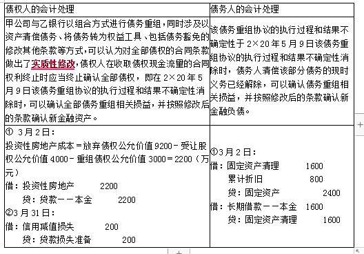 问题 2×16年1月1日,甲公司取得乙银行贷款10000万元,约定贷款期限为4年(即2×19年12月31日到期),年利率6%,按年付息,甲公司已按时支付所有利息。2×19年12月31日,甲公司出现严重资金周转问題,多项债务违约,信用风险增加,无法偿还贷款本金。   (1)2×20年1月10日,乙银行同意与甲公司就该项贷款重新达成协议,新协议约定:   ①甲公司将一项作为固定资产核算的房产转让给乙银行,用于抵偿债务本金2000万元,该房产账面原值2400万元,累计折旧800万元,未计提减值准备;合同生效日   ②甲公司向乙银行增发股票1000万股,面值1元/股,占甲公司股份总额的1%,用于抵偿债务本金4000万元,甲公司股票于2×20年1月10日的收盘价为4元/股;   ③在甲公司履行上述偿债义务后,乙银行免除甲公司1000万元债务本金,并将尚未偿还的债务本金3000万元展期至2×20年12月31日,年利率8%;如果甲公司未能履行①②所述偿债义务,乙银行有权终止债务重组协议,尚未履行的债权调整承诺随之失效。   (2)乙银行该贷款于2×20年1月10日的公允价值为9200万元,予以展期的贷款的公允价值为3000万元。乙银行以摊余成本计量该贷款,已计提货款损失准备600万元。甲公司以摊余成本计量该贷款,裁至2×20年1月10日,该贷款的账面价值为10000万元。不考虑相关税费。   (3)2×20年3月2日,双方办理完成房产转让手续,乙银行将该房产作为投资性房地产核算。   (4)2×20年3月31日,乙银行为该笔贷款补提了200万元的损失准备。   (5)2×20年5月9日,双方办理完成股权转让手续,乙银行将该股权投资分类为以公允价值计量且其变动计入当期损益的金融资产,甲公司股票当日收盘价为4.02元/股。   要求:分别编制债权人(乙银行)和债务人(甲公司)的会计分录。