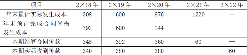 解析 (1)2×18年账务处理如下: ①实际发生合同成本。 借:合同履约成本                   308  贷:原材料                     184.8    应付职工薪酬                  123.2 ②确认计量当年的收入并结转成本。 履约进度=308÷(308+792)×100%=28%; 合同收入=1160×28%=324.8(元)。 借:合同结算——收入结转              324.8  贷:主营业务收入                  324.8 借:主营业务成本                   308  贷:合同履约成本                   308 ③结算合同价款。 借:应收账款                     348  贷:合同结算——价款结算               348 ④实际收到合同价款。 借:银行存款                     340  贷:应收账款                     340 (2)2×19年的账务处理如下: ①实际发生合同成本。 借:合同履约成本              292(600-308)  贷:原材料                     175.2    应付职工薪酬                  116.8 ②确认计量当年的收入并结转成本,同时,确认合同预计损失。 履约进度=600÷(600+600)×100%=50%; 合同收入=1160×50%-324.8=255.2(万元); 合同预计损失=(600+600-1160×(1-50%)=20(万元)。 借:合同结算——收入结转              255.2  贷:主营业务收入                  255.2 借:主营业务成本                   292  贷:合同履约成本                   292 借:主营业务成本                   20  贷:预计负债                     20 ③结算合同价款。 借:应收账款                     392  贷:合同结算——价款结算               392 ④实际收到合同价款。 借:银行存款                     380  贷:应收账款                     380 (3)2×20年的账务处理如下: ①实际发生的合同成本。 借:合同履约成本              376(976-600)  贷:原材料                     225.6   应付职工薪酬                   150.4 ②确认计量当年的合同收入并结转成本,同时调整合同预计损失。 履约进度=976÷(976+244)×100%=80%; 合同收入=1160×80%-324.8-255.2=348(万元); 合同预计损失=(976+244-1160)×(1-80%)-20=-8(万元)。 借:合同结算——收入结转               348  贷:主营业务收入                   348 借:主营业务成本                   376  贷:合同履约成本                   376 借:预计负债                      8  贷:主营业务成本                    8 ③结算合同价款。 借:应收账款                     360  贷:合同结算——价款结算               360 ④实际收到合同价款。 借:银行存款                     380  贷:应收账款                     380 (4)2×21年1-6月的账务处理如下: ①实际发生合同成本。 借:合同履约成本             244(1220-976)  贷:原材料                     146.4    应付职工薪酬                  97.6 ②确认计量当期的合同收入并结转成本及已计提的合同损失。 2×21年1月至6月确认的合同收入=合同总金额-截至目前累计已确认的收入 =1160-324.8-255.2-348=232(万元) 借:合同结算——收入结转               232  贷:主营业务收入                   232 借:主营业务成本                   244  贷:合同履约成本                   244 借:预计负债                     12  贷:主营业务成本                   12 (5)2×22年的账务处理: ①质保期结束且未发生重大质量问题。 借:应收账款                     60  贷:合同结算                     60 ②实际收到合同价款。 借:银行存款                     60  贷:应收账款                     60