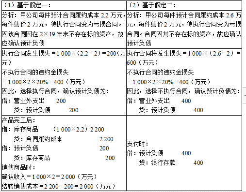 问题 甲公司2×19年12月与丙公司签订商品购销合同,合同规定甲公司应在2×20年3月以每件2万元的价格向丙公司销售1 000件产品,若不能按时交货,将对甲公司处以总价款20%的违约金,签订合同时产品尚未开始生产,甲公司准备生产产品时,原材料价格突然上涨,预计生产产品的成本将超过合同单价。   假定一:甲公司2×19年末预计该产品的单位合同履约成本为2.2万元。2×20年2月底,该产品完工,实际单位合同履约成本仍为2.2万元。   假定二:甲公司2×19年末预计该产品的单位合同履约成本为2.6万元。   要求:根据上述资料,分别编制甲公司的相关会计分录。