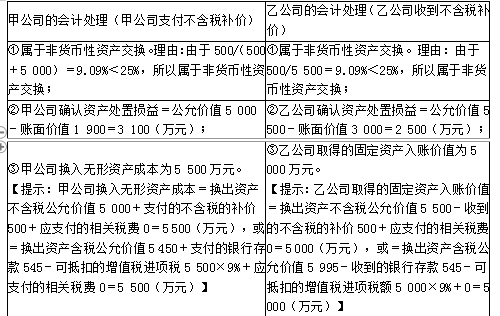 问题 甲公司和乙公司适用的增值税税率为9%(不动产),计税价格等于公允价值,假定该项交换具有商业实质且其换入换出资产的公允价值能够可靠地计量。   2×20年3月甲公司以作为固定资产核算的一套商住两用房交换乙公司作为无形资产的土地使用权,甲公司将收到的土地使用权作为无形资产核算,乙公司将收到的商住两用房作为销售部门的办公用房,有关资料如下:   (1)甲公司换出的商住两用房的账面价值1 900万元(原值为2 000万元,已计提折旧100万元),甲公司开出增值税专用发票,不含税公允价值5 000万元,含税公允价值5 450万元。   (2)乙公司换出的无形资产的账面价值为3 000万元(成本3 500万元,已计提摊销额500万元),乙公司开出增值税专用发票,不含税公允价值5 500万元,含税公允价值5 995万元。   (3)乙公司收到不含税补价500万元(土地使用权不含税公允价值5 500万元-商住两用房不含税公允价值5 000万元)或乙公司收到银行存款545万元(土地使用权含税公允价值5 995万元-商住两用房含税公允价值5 450万元)。   要求:根据上述资料,分别做出甲公司和乙公司的会计处理