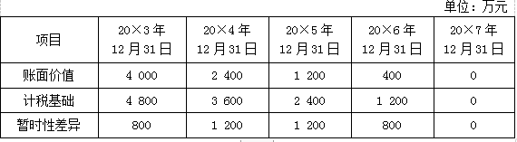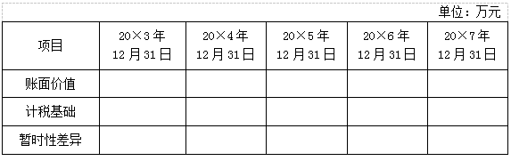问题 甲公司适用的企业所得税税率为25%,经当地税务机关批准,甲公司自20×1年2月取得第一笔生产经营收入所属纳税年度起,享受“三免三减半”的税收优惠政策,即20×1年至20×3年免交企业所得税,20×4年至20×6年减半,按照12.5%的税率交纳企业所得税。甲公司20×3年至20×7年有关会计处理与税收处理不一致的交易或事项如下: (1)20×2年12月10日,甲公司购入一台不需要安装即可投入使用的行政管理用A设备,成本6 000万元,该设备采用年数总和法计提折旧,预计使用5年,预计无净残值。税法规定,固定资产按照年限平均法计提的折旧准予在税前扣除。假定税法规定的A设备预计使用年限及净残值与会计规定相同。 (2)甲公司拥有一栋五层高的B楼房,用于本公司行政管理部门办公。迁往新建的办公楼后,甲公司20×7年1月1日与乙公司签订租赁协议,将B楼房租赁给乙公司使用。租赁合同约定,租赁期为3年,租赁期开始日为20×7年1月1日,年租金为240万元,于每月末分期支付。B楼房转换为投资性房地产前采用年限平均法计提折旧,预计使用50年,预计无净残值;转换为投资性房地产后采用公允价值模式进行后续计量。转换日,B楼房原价为800万元,已计提折旧为400万元,公允价值为1 300万元。20×7年12月31日,B楼房的公允价值为1 500万元。税法规定,企业的各项资产以历史成本为基础计量;固定资产按照年限平均法计提的折旧准予在税前扣除。假定税法规定的B楼房使用年限及净残值与其转换为投资性房地产前的会计规定相同。 (3)20×7年7月1日,甲公司以1 000万元的价格购入国家同日发行的国债,款项已用银行存款支付。该债券的面值为1 000万元,期限为3年,年利率为5%(与实际利率相同),利息于每年6月30日支付,本金到期一次付清。甲公司根据其管理该国债的业务模式和该国债的合同现金流量特征,将购入的国债分类为以摊余成本计量的金融资产。税法规定,国债利息收入免交企业所得税。 (4)20×7年9月3日,甲公司向符合税法规定条件的公益性社团捐献现金600万元。税法规定,企业发生的公益性捐赠支出不超过年度利润总额12%的部分准许扣除。 其他资料如下: 第一,20×7年度,甲公司实现利润总额4 500万元。 第二,20×3年初,甲公司递延所得税资产和递延所得税负债无余额,无未确认递延所得税资产的可抵扣暂时性差异的可抵扣亏损,除上面所述外,甲公司20×3年至20×7年无其他会计处理与税收处理不一致的交易或事项。 第三,20×3年至20×7年各年末,甲公司均有确凿证据表明未来期间很可能获得足够的应纳税所得额用来抵扣可抵扣暂时性差异。 第四,不考虑除所得税以外的其他税费及其他因素。 要求: (1)根据资料(1),分别计算,甲公司20×3年至20×7年各年A设备应计提的折旧,并填写完成下列表格。 (2)根据资料(2),编制甲公司20×7年与B楼房转换为投资性房地产及其后续公允价值变动相关的会计分录。 (3)根据资料(3),编制甲公司20×7年与购入国债及确认利息相关的会计分录。 (4)根据上述资料,计算甲公司20×3年至20×6年各年末的递延所得税资产或负债余额。 (5)根据上述资料,计算甲公司20×7年的应交所得税和所得税费用,以及20×7年末递延所得税资产或负债余额,并编制相关会计分录。