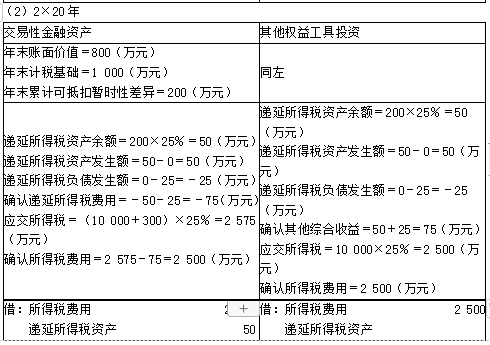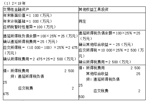 问题 甲公司适用的所得税税率为25%,各年税前会计利润均为10 000万元。假定2×19年期初暂时性差异余额为零,不考虑其他因素。有关业务如下:   (1)2×19年11月20日,甲公司自公开市场取得一项权益性投资,分类为交易性金融资产或指定为其他权益工具投资(为便于对比说明),支付价款1 000万元,本年末该权益性投资的公允价值为1 100万元。   (2)2×20年12月31日,该投资的公允价值为800万元。2×20年末所得税会计处理如下:   要求:分别编制2×19年和2×20年有关交易性金融资产和其他权益工具投资的相关会计分录。