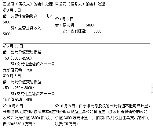 问题 乙公司(债权人)和甲公司(债务人)债务重组资料如下:   (1)2×19年3月6日,甲公司从乙公司购买一批材料,约定6个月后甲公司应结清款项5000万元(假定无重大融资成分)。乙公司将该应收款项分类为以公允价值计量且其变动计入当期损益的金融资产;甲公司将该应付款项分类为以摊余成本计量的金融负债。   (2)2×19年6月30日,应收款项和应付款项的公允价值均为4250万元。   (3)2×19年9月6日,甲公司因无法支付货款与乙公司协商进行债务重组,双方商定乙公司将该债权转为对甲公司的股权投资。当日应收款项和应付款项的公允价值均为3800万元。   (4)2×19年10月8日,乙公司办理了对甲公司的增资手续,甲公司和乙公司分别支付手续费等相关费用75万元和60万元。债转股后甲公司总股本为6250万元,乙公司持有的抵债股权占甲公司总股本的20%,对甲公司具有重大影响,甲公司股权公允价值不能可靠计量。甲公司应付款项的账面价值仍为5000万元。应收款项和应付款项的公允价值仍为3800万元。   假定不考虑其他相关税费。   要求:   (1)编制乙公司(债权人)2×19年3月6日至10月8日的会计分录。   (2)编制甲公司(债务人)2×19年3月6日至10月8日的会计分录。
