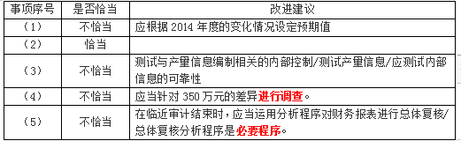 问题 (2015年)甲公司是ABC会计师事务所的常年审计客户。A注册会计师负责审计甲公司2014年度财务报表。审计工作底稿中与分析程序相关的部分内容摘录如下: (1)甲公司所处行业2014年度市场需求显著下降。A注册会计师在实施风险评估分析程序时,以2013年财务报表已审数为预期值,将2014年财务报表中波动较大的项目评估为存在重大错报风险的领域。 (2)A注册会计师对营业收入实施实质性分析程序,将实际执行的重要性作为已记录金额与预期值之间可接受的差异额。 (3)甲公司的产量与生产工人工资之间存在稳定的预期关系。A注册会计师认为产量信息来自非财务部门,具有可靠性,在实施实质性分析程序时据以测算直接人工成本。 (4)A注册会计师对运输费用实施实质性分析程序,确认已记录金额与预期值之间接受的差异额为150万元,实际差异为350万元。A注册会计师就超出可接受差异额的200万元询问了管理层,并对其答复获取了充分、适当的审计证据。 (5)A注册会计师在审计过程中未提出审计调整建议,已审财务报表与未审财务报表一致,因此认为无需在临近审计结束时运用分析程序对财务报表进行总体复核。 要求: 针对上述第(1)至第(5)项,逐项指出A注册会计师的做法是否恰当。如不恰当,提出改进建议。