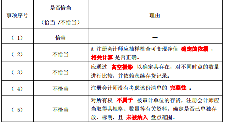 问题 ABC 会计师事务所的 A注册会计师负责审计多家被审计单位 2019 年度 财务报表。与 存货审计 相关事项如下: ( 1)甲公司从事放射性药物生产,由于无法对存货实施监盘, A注册会计师通过实施替代审计程序获取了与存货相关的充分、适当的审计证据。 ( 2)乙公司对期末存货采用成本与可变现净值孰低的方法计价, A注册会计师认为乙公司计提存货跌价准备的方法合理,故存货跌价准备的计提不存在错误。 ( 3)丙公司地处高寒山区,以放养高山牛而享誉市场, A注册会计师在对高山牛的数量进行监盘时因为难以控制高山牛的移动,故在监盘时选择样品进行化验与分析并依赖永续存货记录。 ( 4)因为丁公司的存货存放在多个地点, A注册会计师要求丁公司提供一份完整的存货存放地点清单。按照丁公司提供的清单确定了需要监盘的地点。 ( 5)在监盘戊公司公司存货时, A注册会计师发现角落里有一堆原材料未纳入盘点范围,戊公司财务经理解释说该批材料已经出售,购货方企业仓库正在修建,该批材料是暂时存放在戊公司的, A注册会计师认为其解释合理,未实施其他审计程序。 要求: 针对上述第( 1)至( 5)项,逐项指出 A注册会计师的做法是否恰当。如不恰当,简要说明理由。