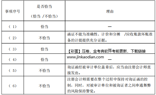 问题 ABC 会计师事务所的 A注册会计师负责审计甲公司 2019 年度 财务报表。审计工作底稿中 与函证有关 的部分内容摘录如下: ( 1)甲公司的一个不重要客户乙公司已破产注销, A注册会计师决定不对应收乙公司的款项实施函证程序,在审计工作底稿中记录了不实施函证的理由,并实施了替代审计程序,结果满意。 ( 2) A注册会计师对应收丙公司的款项实施函证程序。因回函显示无差异, A注册会计师认可了管理层对应收丙公司款项不计提坏账准备的处理。 ( 3) A注册会计师评估认为预付账款存在低估风险,因此,在询证函中未填列乙公司账面余额,而是要求被询证者提供余额信息。 ( 4)为了确保发给客户戊公司询证函中的名称、地址等内容的准确性, A注册会计师通过天眼查网站核对了戊公司的名称和地址。 ( 5)甲公司将询证函盖章后,恰逢快递人员上门派件,甲公司财务经理将询证函直接交给了快递人员。 ( 6)为了获取可靠的审计证据, A注册会计师选择了在被审计单位人员的陪同下亲自将询证函送至被询证者。因为陪同人员对被询证者公司较为熟悉, A注册会计师选择在接待室等待,由陪同人员对整个函证过程保持控制。 要求: 针对上述第( 1)至( 6)项,逐项指出 A注册会计师的做法是否恰当。如不恰当,简要说明理由。