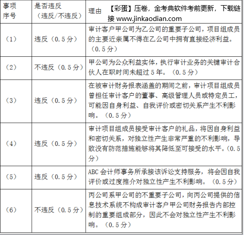 问题 ABC会计师事务所委派A注册会计师担任上市公司甲公司2019年度财务报表审计的项目合伙人。ABC会计师事务所和XYZ公司处于同一网络。审计项目组在审计过程中遇到下列事项: (1)甲公司系上市公司乙公司的重要子公司。A注册会计师得知对甲公司审计业务实施项目质量控制复核的人员的父亲拥有乙公司的1000股股票。 (2)B注册会计师在2014年度至2015年度期间担任甲公司财务报表审计项目经理,自2016年度起,ABC会计师事务所任命B注册会计师担任甲公司2016年至2019年度财务报表审计的签字注册会计师。 (3)项目组成员C注册会计师曾担任甲公司的会计主管,2018年底于甲公司辞职后加入ABC会计师事务所。 (4)A注册会计师受邀参加了甲公司年度股东大会,在会上参与抽奖并抽中三等奖,奖品为甲公司生产的产品。 (5)在审计执行过程中,恰逢甲公司诉讼案件审判,甲公司鉴于ABC会计师事务所专业能力优秀又聘请其作为辩证方,ABC会计师事务所承接了该诉讼支持服务。 (6)丙公司系甲公司的不重要子公司,XYZ公司为丙公司提供了信息技术系统服务,该系统构成丙公司财务报告内部控制的重要组成部分。 (1)要求:针对上述第(1)至(6)项,逐项指出是否可能存在违反中国注册会计师职业道德守则有关独立性规定的情况,并简要说明理由。将答案直接填入答题区相应的表格内。