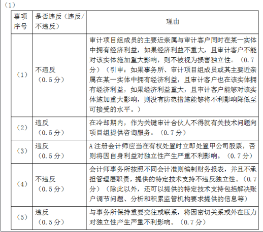 问题 ABC会计师事务所委派A注册会计师担任上市公司甲公司2019年度财务报表审计项目合伙人。ABC会计师事务所和XYZ公司处于同一网络。审计项目组在审计过程中遇到下列事项: (1)A注册会计师的妻子持有乙公司1000股股票,恰巧甲公司也在乙公司中有投资,股票市值为20万,持股比例为0.1%。 (2)A注册会计师于2014年至2018年担任甲公司财务报表审计项目合伙人,按照会计师事务所质量控制制度,2019年被轮换出项目组后,A注册会计师仅就有关技术问题向项目组提供咨询。 (3)A注册会计师因继承获得甲公司股票10000股,承诺将在有权处置这些股票之日起一个月内出售。 (4)甲公司要求会计师事务所完成报表在不同会计准则下的转换服务,会计师事务所不承担管理层职责。 (5)B注册会计师曾任ABC会计师事务所合伙人,2019年12月离职后担任甲公司独立董事,同时兼任XYZ公司技术顾问。 (1)要求:针对上述第(1)至(5)项,逐项指出是否可能存在违反中国注册会计师职业道德守则有关独立性规定的情况,并简要说明理由。将答案直接填入答题区相应的表格内。