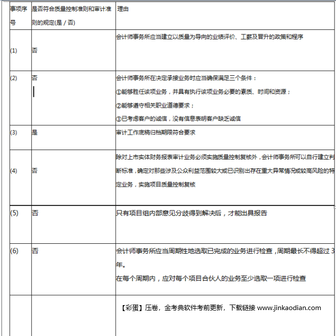 ABC会计师事务所正在制订业务质量控制制度,经过事务所领导层集体研究,确立了下列重大质量控制制度:(1)注册会计师的晋升与考核以业务收入排名为主要...